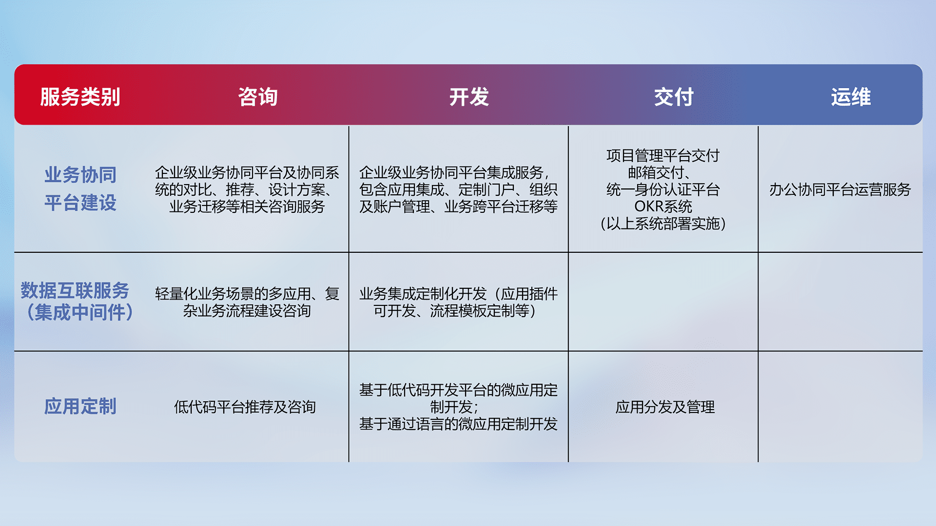 针对钉钉、、、、企微、、IDaas等平台级产品提供产品的规划、、、、方案、、、、交付、、、、定制化开发等服务,,,实现如统一协同办公、、、、智能客户服务、、、混合会议管理、、、智能数据查询、、、、等业务场景,,实现数字化转型。。。。