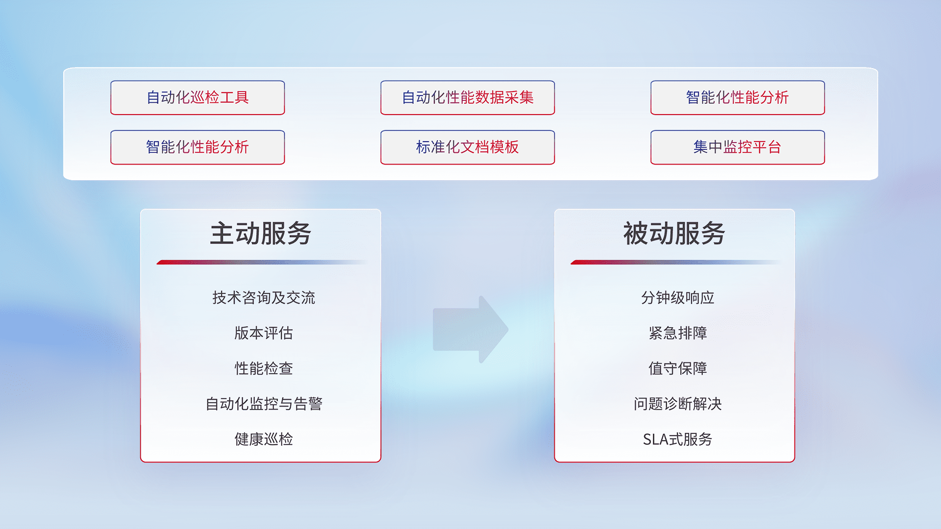 智能化工具和标准化文档,,,保障服务质量,,,提供主动服务(包含技术咨询、、版本评估、、、性能检查、、自动化监控与告警、、、、健康巡检)和被动服务包含(分钟级响应、、、、紧急排障、、、值守保障、、问题诊断解决、、、、SLA服务)。。。。